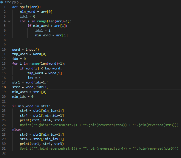 - 함수를 만들어 보기 전에 먼저 입력받은 문자열에서 가장 작은 글자 기준으로 한번 자르고,